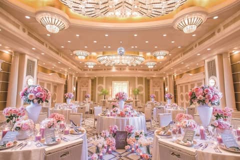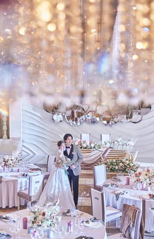 宝石のように煌めくシャンデリアが印象的で可憐な雰囲気。特別な一日にふさわしい輝くデザインに心奪われる空間で大切なゲストとのひと時をお楽しみください。