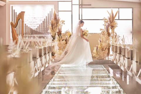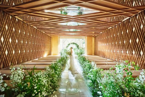 清らかなホワイトカラーで統一された、スワロフスキーが輝く聖なるチャペル。20万パーツのスワロフスキーが輝くバージンロードは、花嫁を美しく煌めかせます。